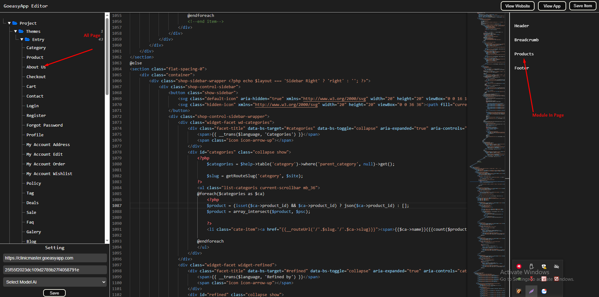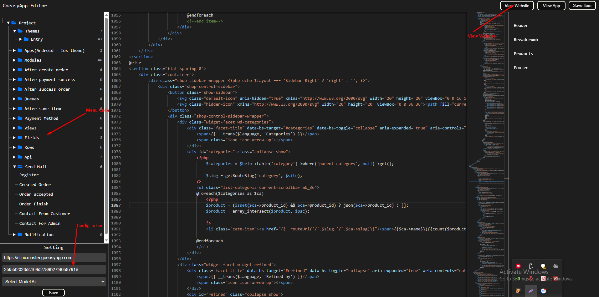 To be able to code on editor.goeasyapp.com, you must first enter your domain and token obtained from your website’s admin panel.