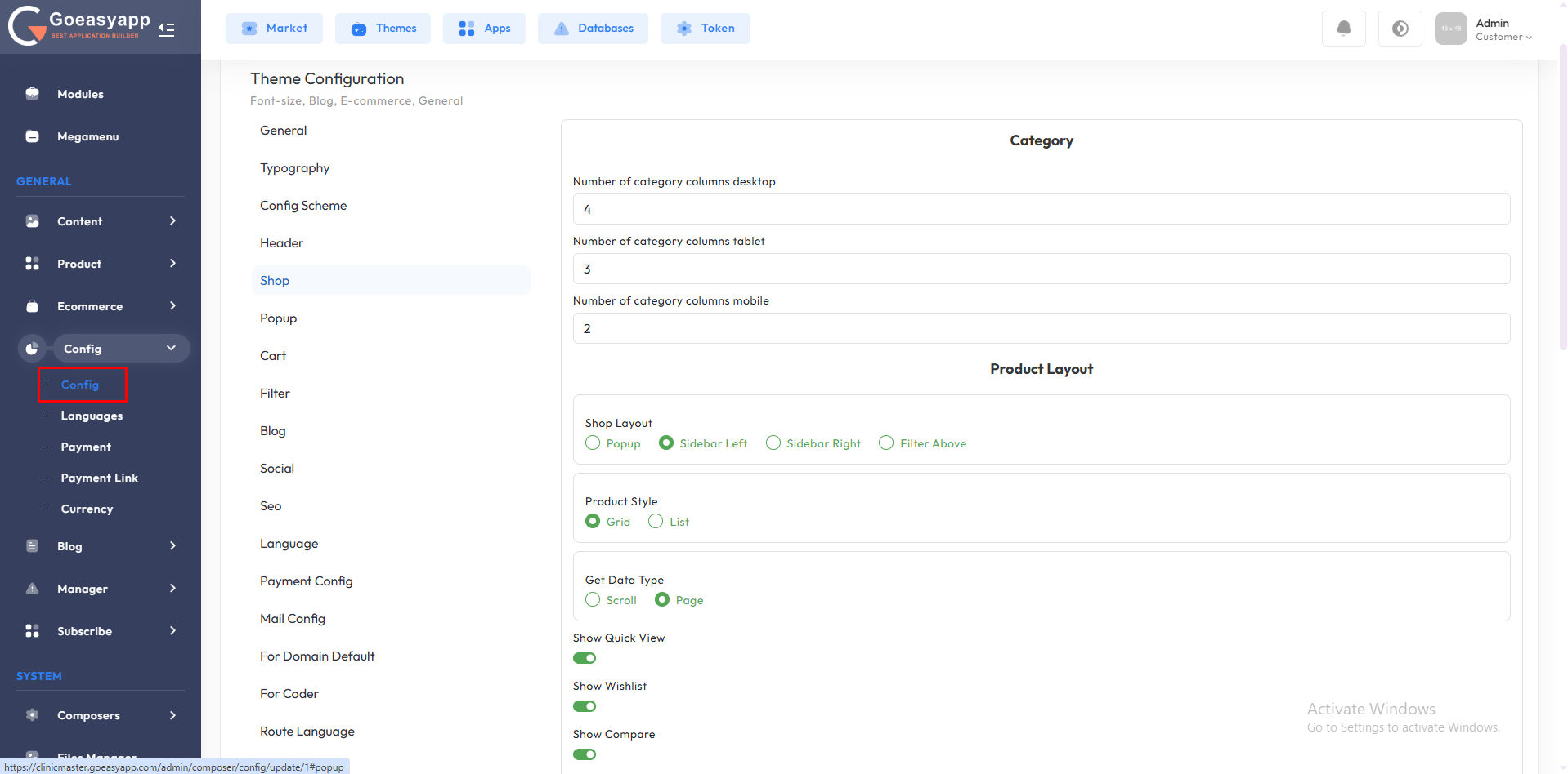 General configuration for the system such as logo, default interface, seo, default language, configuration of some interface related modules.....