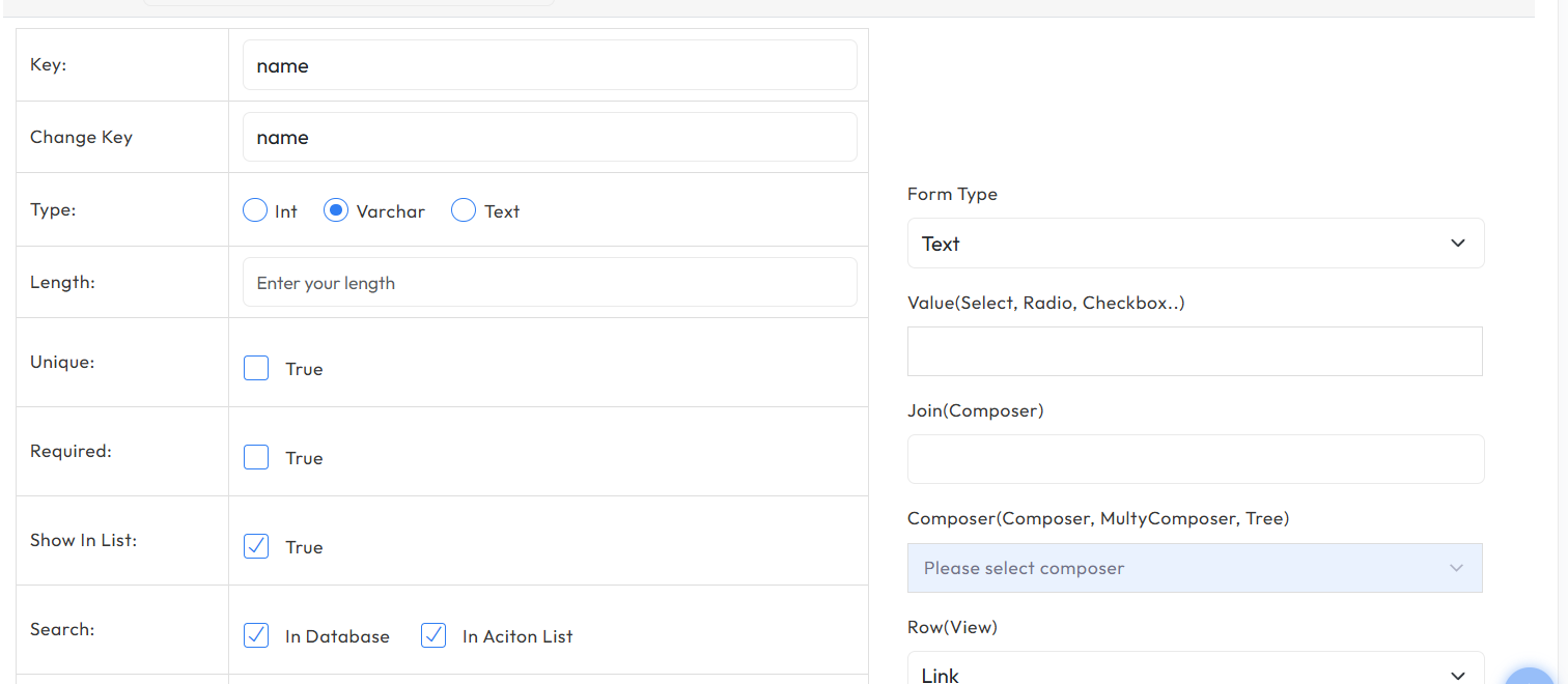 Available inputs such as text, editor, textarea, or custom-coded fields. Used when creating a new composer or linking configuration between database and module.